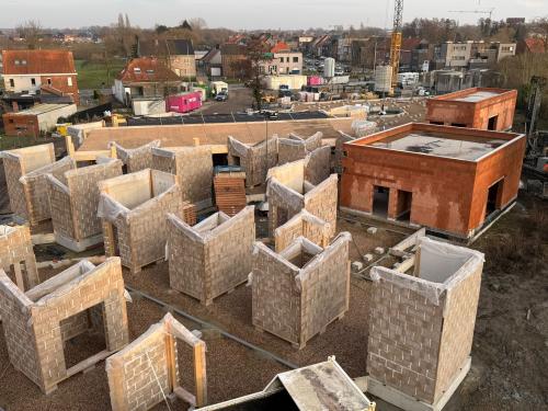 Op de werf is men gestart met de metselwerken op de kelders en het leggen van de riolering. Aansluitend zal eerste isolatielaag bestaande uit schelpen aangebracht worden.