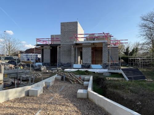 Op de werf is men gestart met de metselwerken op de kelders en het leggen van de riolering. Aansluitend zal eerste isolatielaag bestaande uit schelpen aangebracht worden.