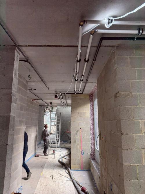 In één gebouw ligt de vloerverarming en chape, in het andere gebouw wordt dit de komende weken afgewerkt, zodat voor de kerstvakantie ook deze klus geklaard is.